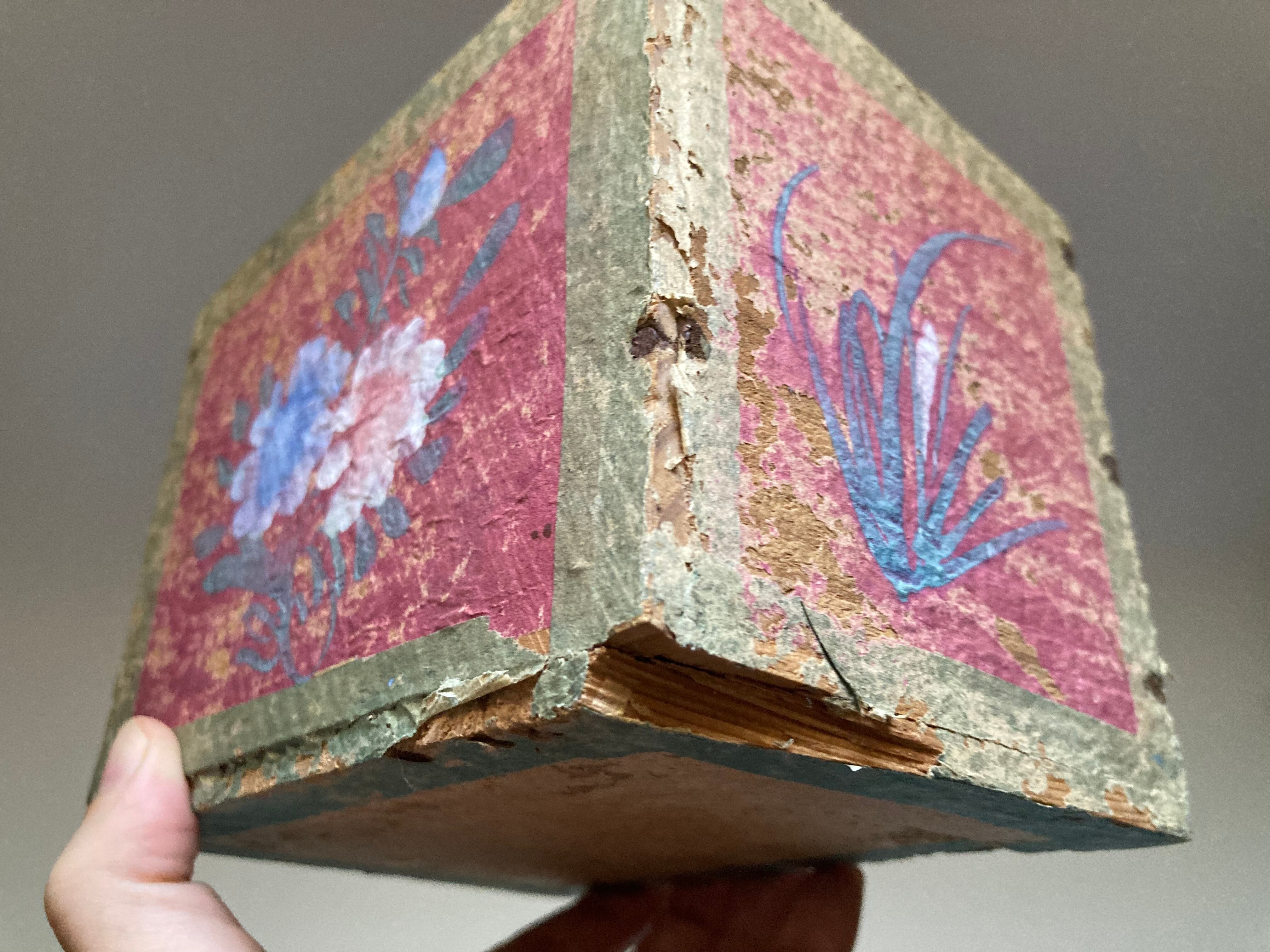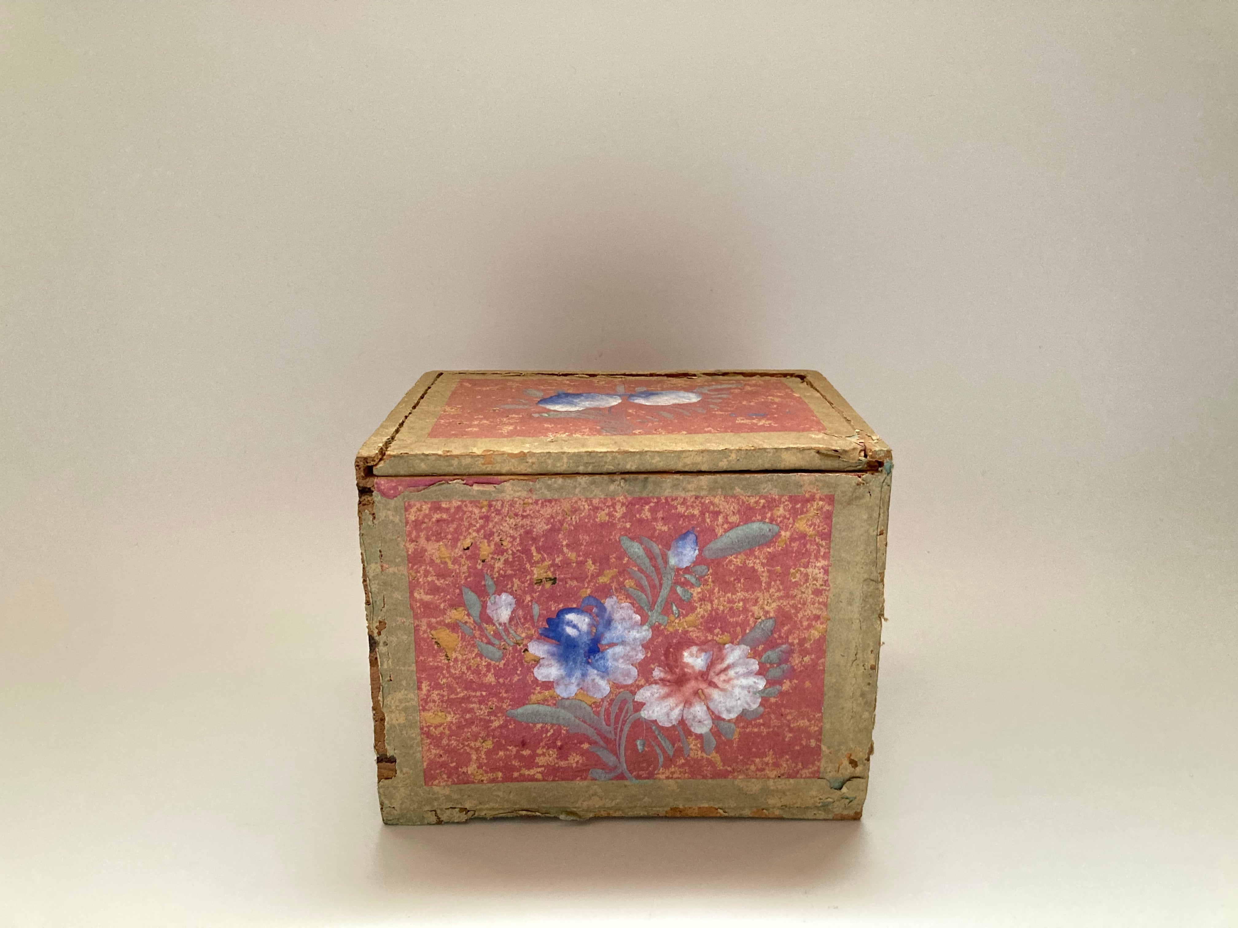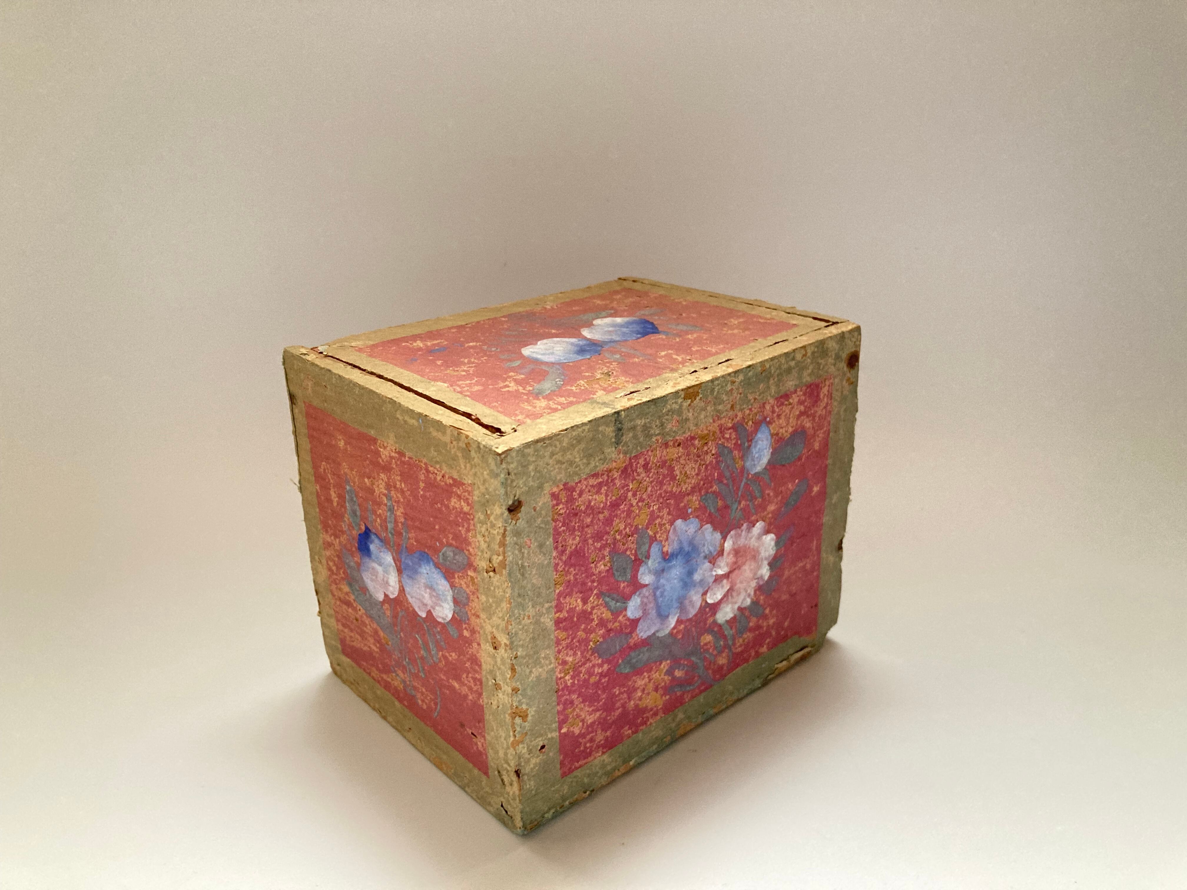 スライド式の蓋が付いた木箱に、草花や桃の描かれた薄紙が貼られています。
