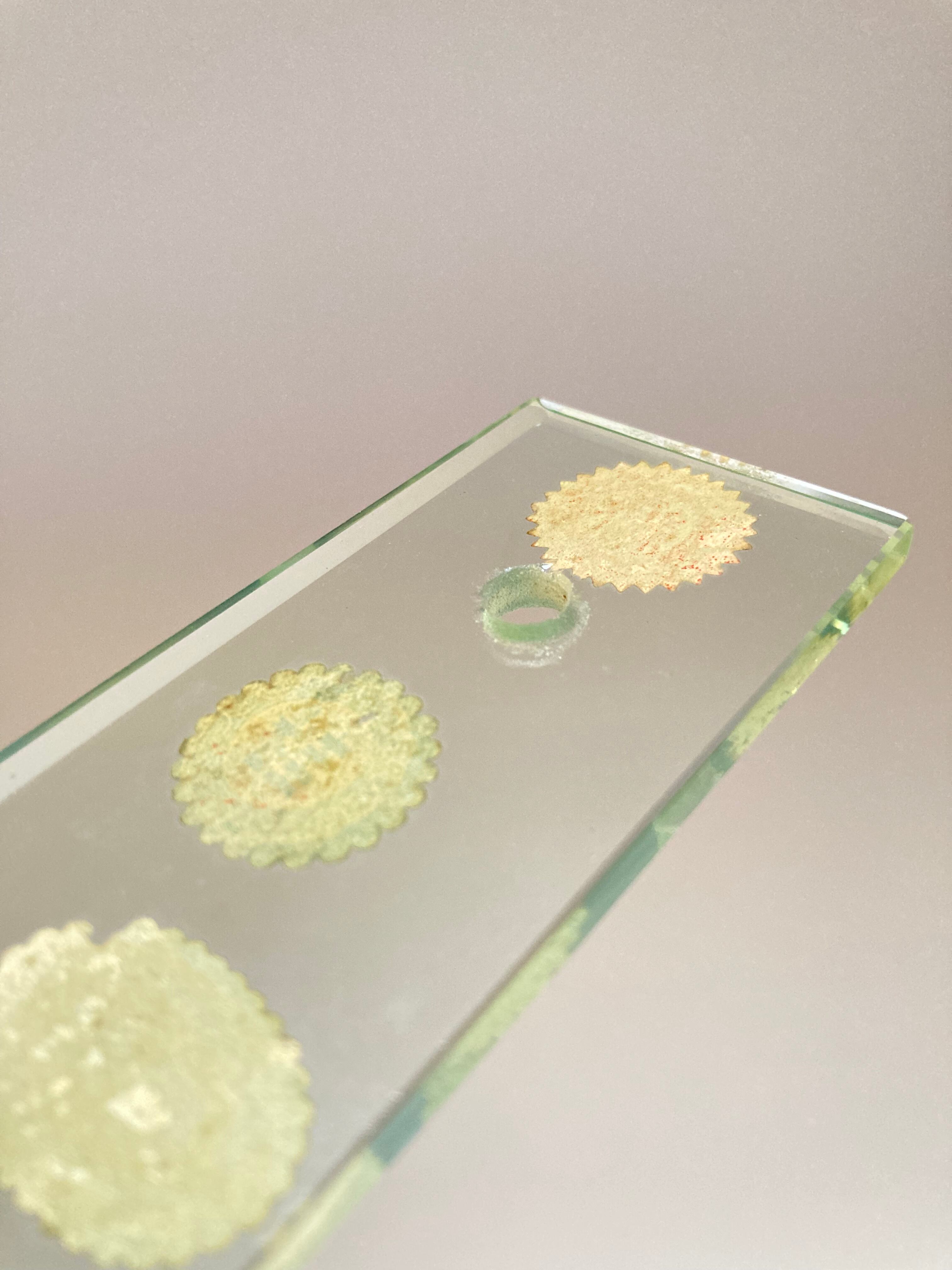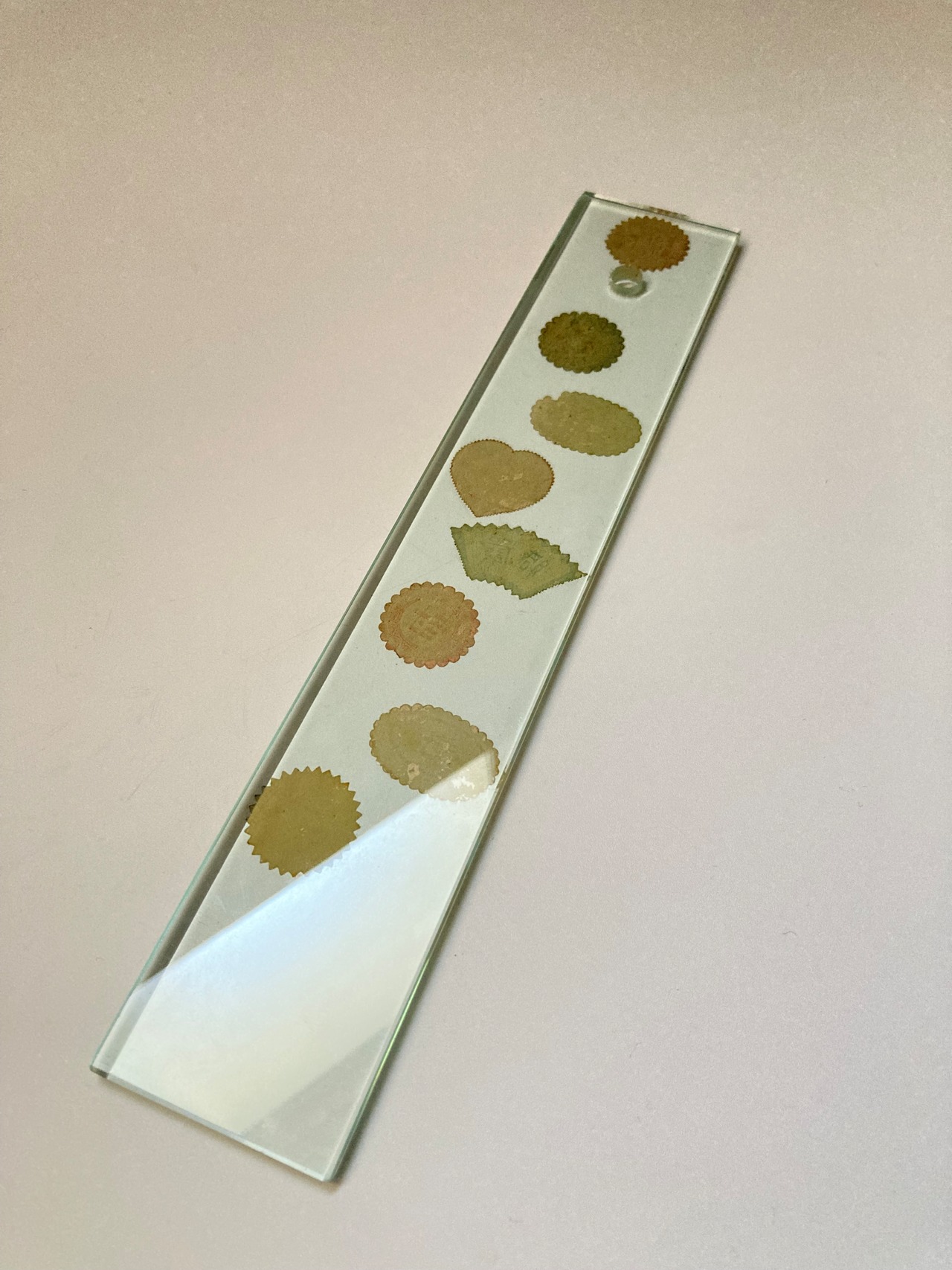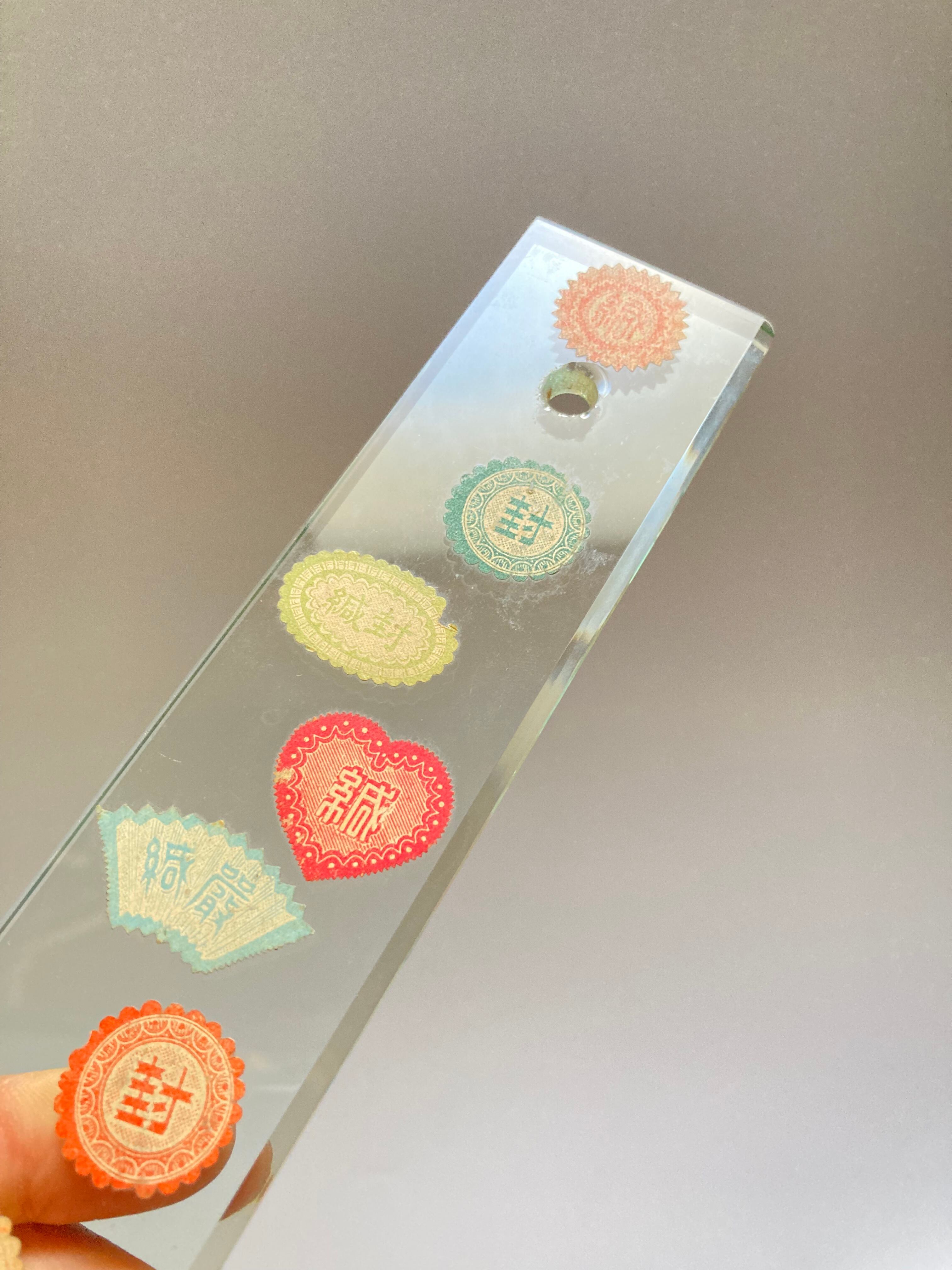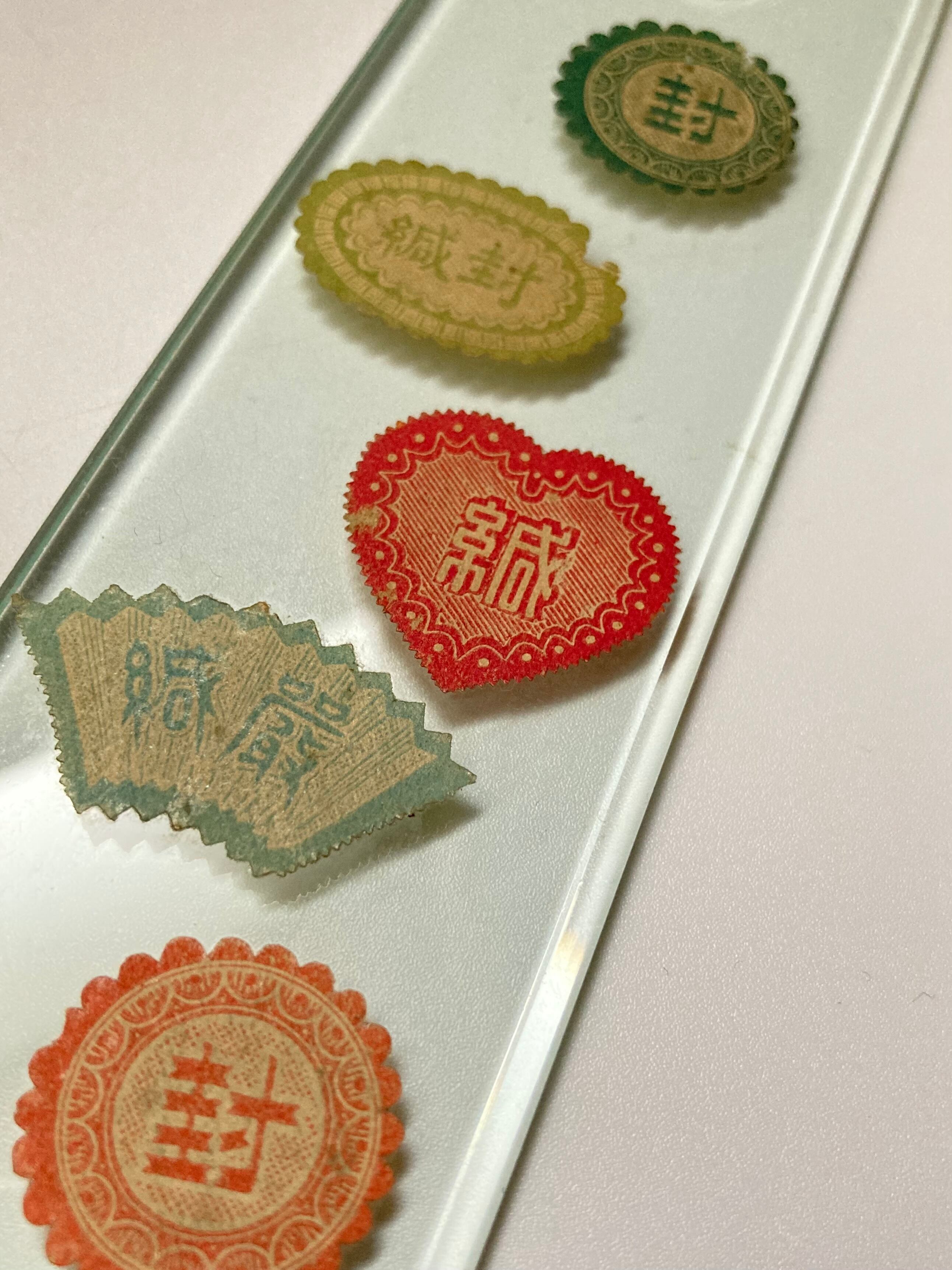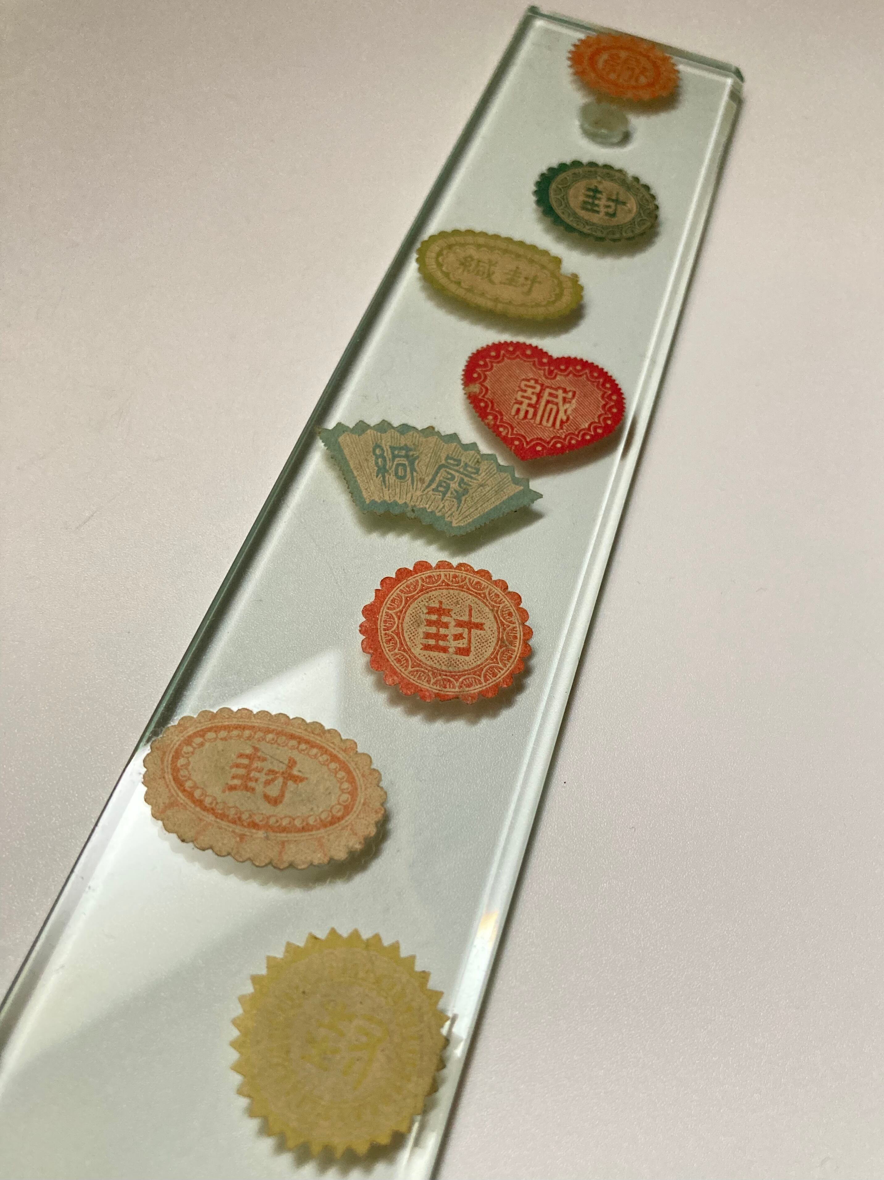 「封」などのシールがランダムに貼られており、位置や色のバランスなど、デザインでは達することのできない、無作為のきれいさがあります。